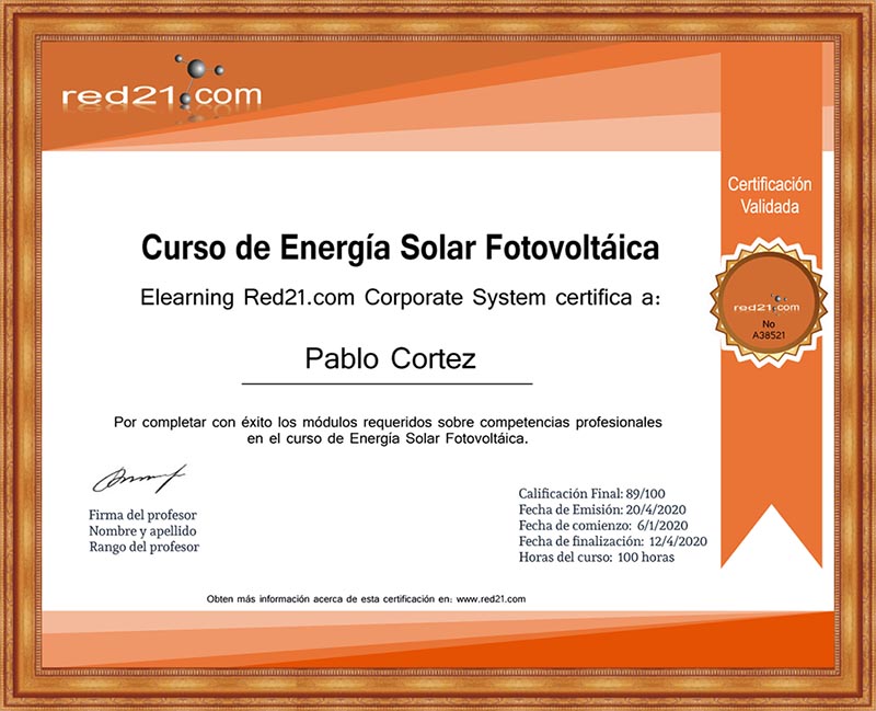 Al presentar, y aprobar la prueba final, recibirás un certificado de Aprobación del curso emitido por la Distance Learning Red21.com Corporate System reconocido por las principales empresas bajo la modalidad de enseñanza privada. A continuación un ejemplo de un certificado.