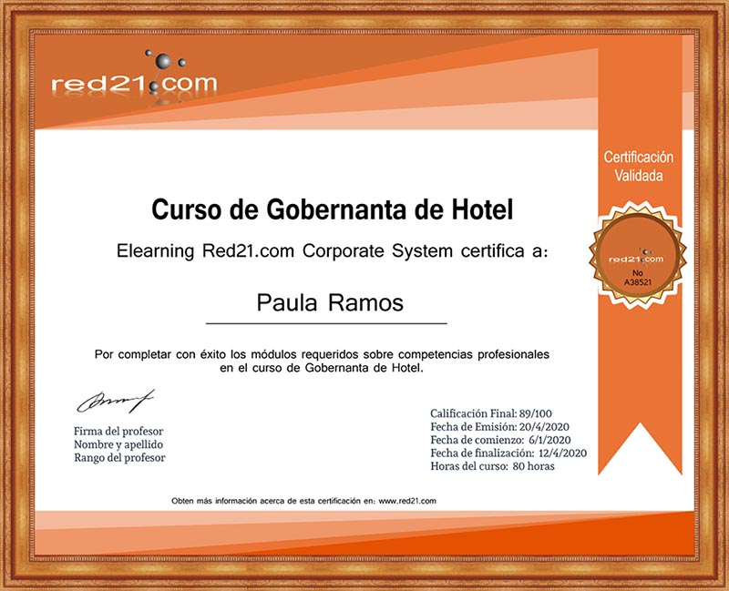 Al finalizar el curso de Gobernanta de Hotel recibirás una doble certificación en Curso de Gobernanta de Hotel (60 horas) y Curso de Atención al cliente en Hotelería (40 horas), los dos emitidos por la Distance Learning Red21.com Corporate System.