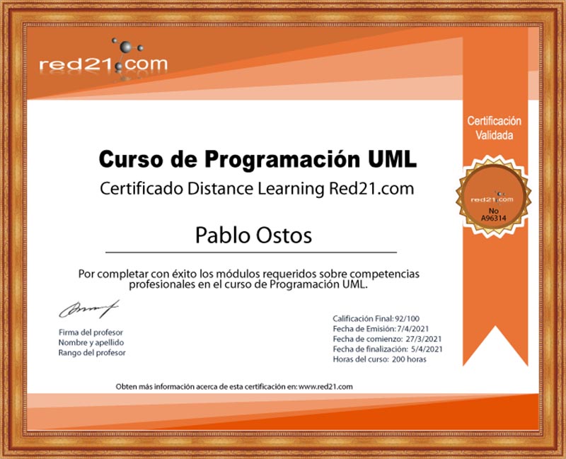 Al presentar, y aprobar la prueba final, recibirás un certificado de Aprobación del curso emitido por la Distance Learning Red21.com Corporate System reconocido por las principales empresas bajo la modalidad de enseñanza privada. A continuación un ejemplo de un certificado.