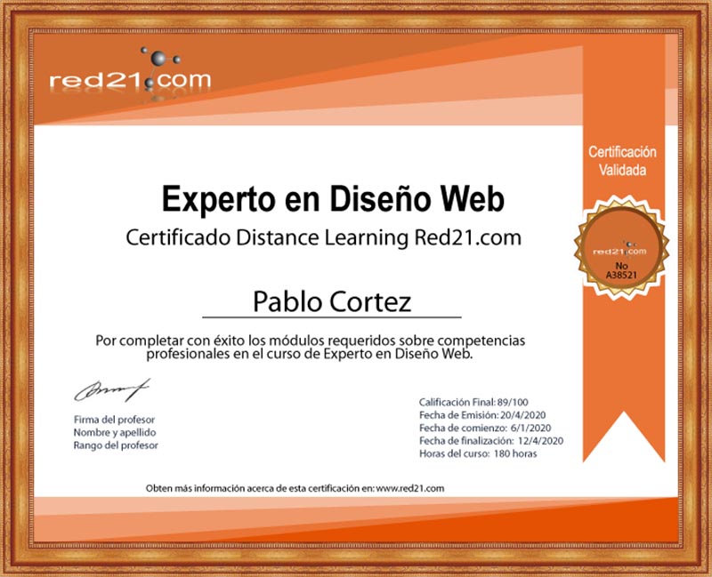 Al presentar, y aprobar la prueba final, recibirás un certificado de Aprobación del curso emitido por la Distance Learning Red21.com Corporate System reconocido por las principales empresas bajo la modalidad de enseñanza privada. A continuación un ejemplo de un certificado.