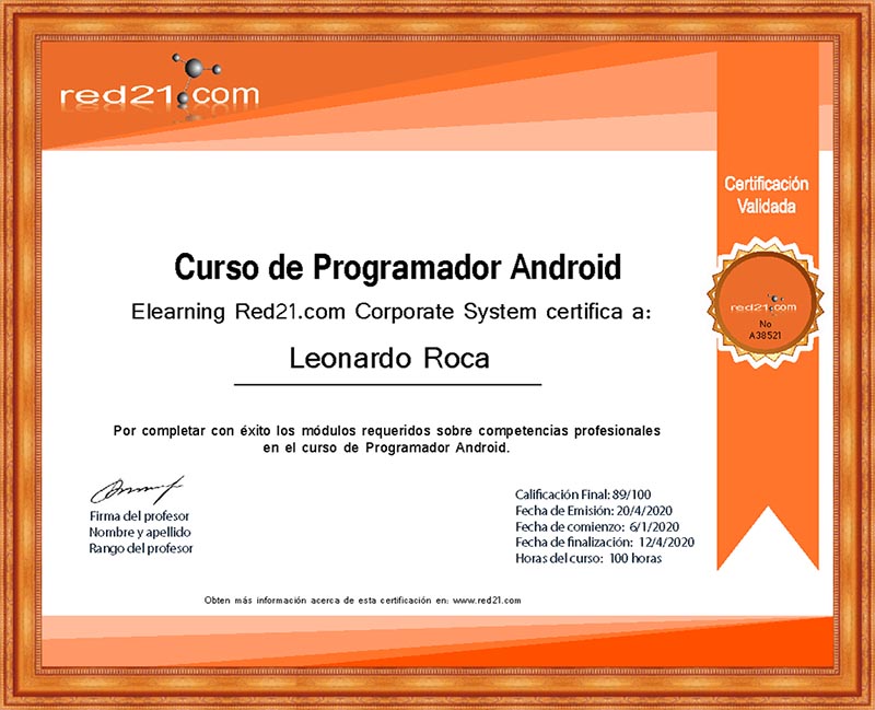 Al presentar, y aprobar la prueba final, recibirás un certificado de Aprobación del curso emitido por la Distance Learning Red21.com Corporate System reconocido por las principales empresas bajo la modalidad de enseñanza privada. A continuación un ejemplo de un certificado.