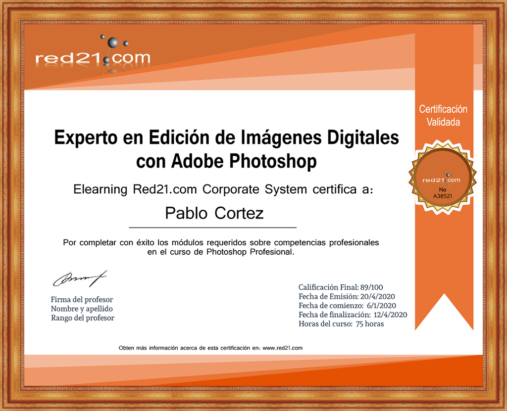 Al presentar, y aprobar la prueba final, recibirás un certificado de Aprobación del curso emitido por la Distance Learning Red21.com Corporate System reconocido por las principales empresas bajo la modalidad de enseñanza privada. A continuación un ejemplo de un certificado.