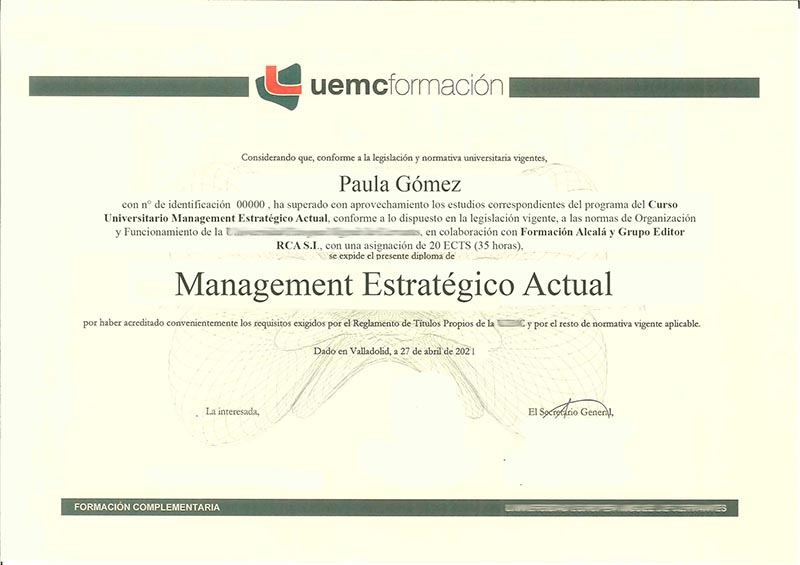 Al finalizar el curso de Administración de Empresas recibirás una doble certificación en Técnico en Administración de Empresas (120 horas) emitido por la Distance Learning Red21.com Corporate System y proyecto final Curso de Management Estratégico (35 horas) emitido por la Universidad Europea Miguel de Cervantes que incluye apostillado internacional. La certificación tiene un costo adicional de 115 USD.