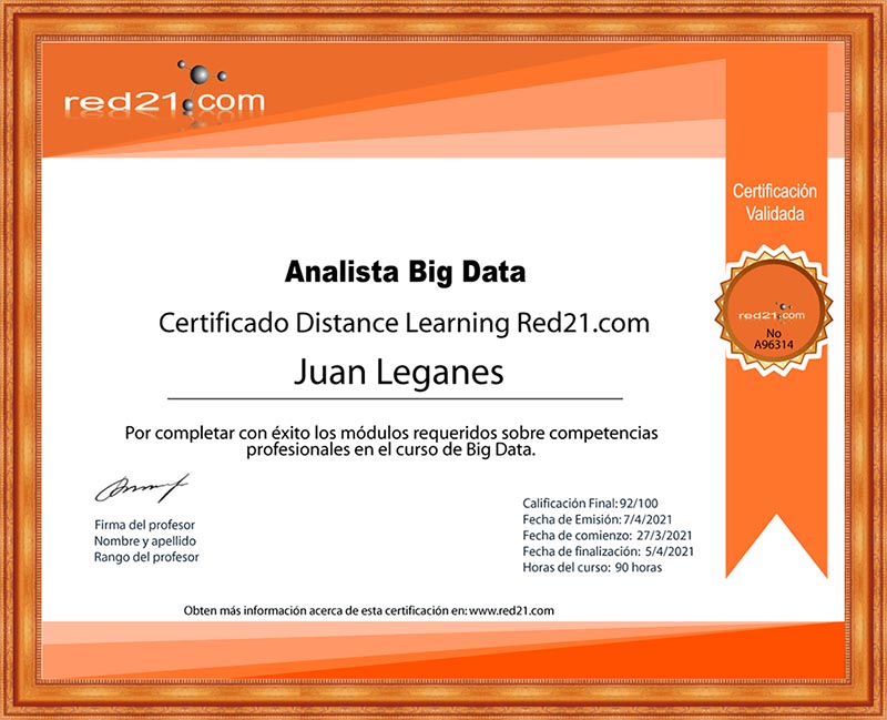 Al presentar, y aprobar la prueba final, recibirás un certificado de Aprobación del curso emitido por la Distance Learning Red21.com Corporate System reconocido por las principales empresas bajo la modalidad de enseñanza privada. A continuación un ejemplo de un certificado.