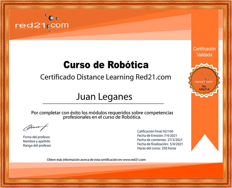 Al presentar, y aprobar la prueba final, recibirás un certificado de Aprobación del curso emitido por la Distance Learning Red21.com Corporate System reconocido por las principales empresas bajo la modalidad de enseñanza privada. A continuación un ejemplo de un certificado.
