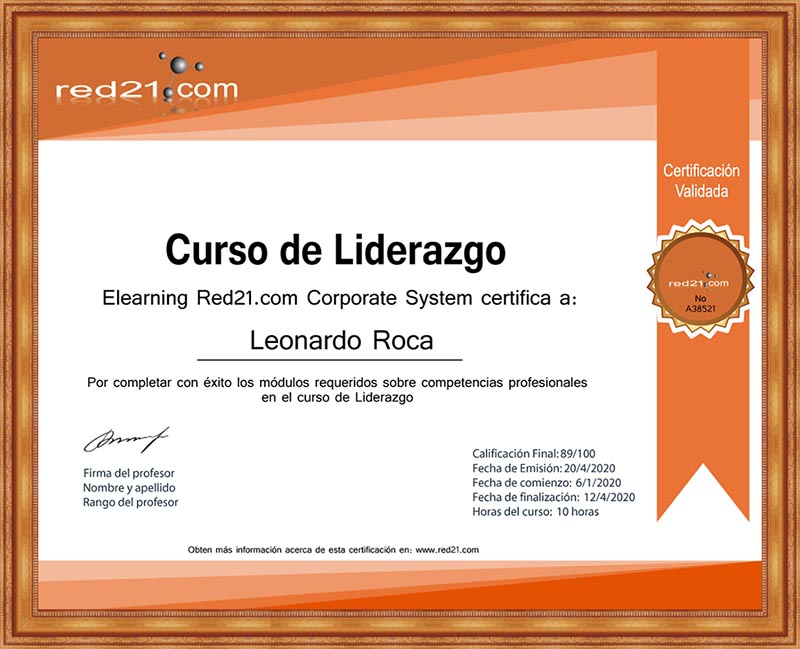 Al presentar, y aprobar la prueba final, recibirás un certificado de Aprobación del curso emitido por la Distance Learning Red21.com Corporate System reconocido por las principales empresas bajo la modalidad de enseñanza privada. A continuación un ejemplo de un certificado.