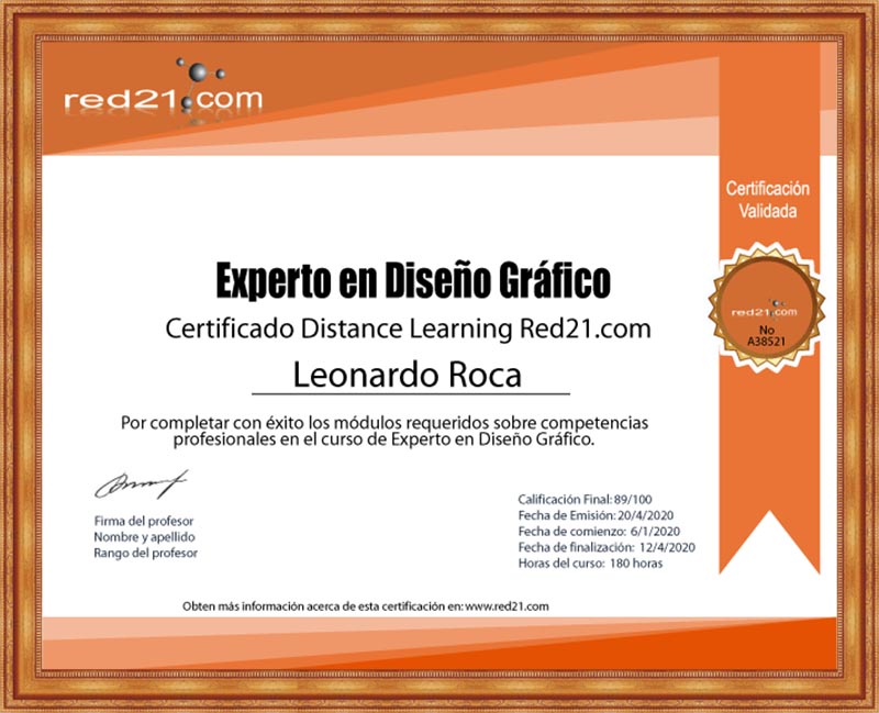 Al presentar, y aprobar la prueba final, recibirás un certificado de Aprobación del curso emitido por la Distance Learning Red21.com Corporate System reconocido por las principales empresas bajo la modalidad de enseñanza privada. A continuación un ejemplo de un certificado.