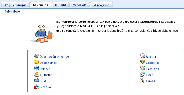 Una vez que ingresas a la plataforma de aprendizaje, o aula virtual, aparecerán las distintas opciones de acceso. En este caso vemos, por ejemplo, el acceso a las opciones del curso de Teletrabajo.