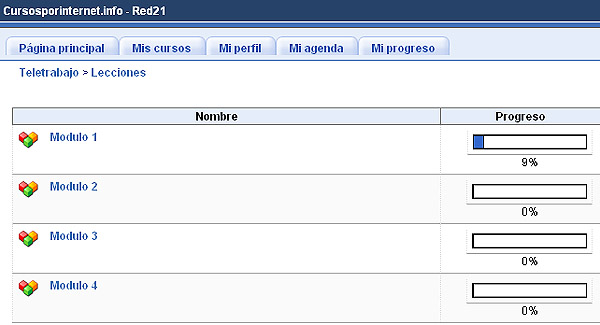 Donde tendrás acceso a los módulos del curso y verás el avance que vas teniendo en cada módulo. Para acceder al módulo 1, debes hacer clic sobre el enlace Módulo 1 y verás: