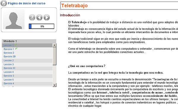 A la izquierda de la pantalla, verás la lecciones y sus ejercicios y, a la derecha, la lección seleccionada. En la parte superior izquierda verás el avance que vas teniendo en el curso y, a su vez, puedes incluir una fotografía tuya (es opcional).